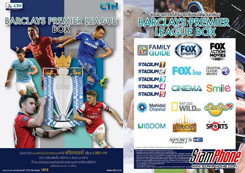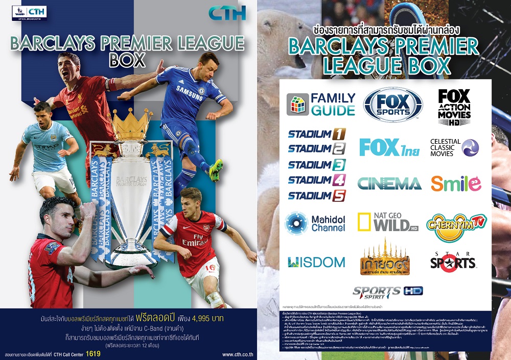 บริษัท ซีทีเอช จำกัด (มหาชน) มุ่งหน้าสร้างกระแสโปรโมชั่นร้อนแรงอย่างต่อเนื่อง วันนี้ปั้นโปรโมชั่นใหม่และคุ้มยิ่งกว่า ออกมาเอาใจคอบอลทั่วประเทศ ใน “กล่องบอลอังกฤษ” (Barclays Premier League Box) พร้อมโปรโมชั่นราคาโดนใจ..สุดคุ้ม เพียง 4,995 บาท ลูกค้าสามารถรับชมการแข่งขันฟุตบอลพรีเมียร์ลีกอังกฤษสดทุกแมทซ์ได้ฟรีตลอดปี (ระยะเวลา 12 เดือน) และนอกจากจะได้ชมสดจริง..เชียร์สุดใจกันแล้ว ลูกค้ายังได้เต็มอิ่มกับช่องทีวีดิจิทัลและช่องสาระบันเทิงของซีทีเอชอีกหลากหลาย อาทิ FOX Sports, FOX Action Movies, FOX ไทย, STAR Sports, NAT GEO WILD, SPORTS Spirit, Cinema, Celestial Classic Movies, Wisdom, Mahidol Channel, Smile,Family Guide, ช่องเชิญยิ้ม, ช่องเก้ายอด เป็นต้น