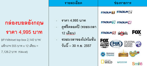 นอกจากนั้นลูกค้ายังได้เต็มอิ่มกับช่องทีวีดิจิทัลรวมถึงหลากหลายช่องรายการคุณภาพจากซีทีเอช ทั้งการแข่งขันกีฬาระดับโลก, ภาพยนตร์, ช่องสารคดี, วาไรตี้ต่างๆเป็นต้น โดยระยะเวลาของโปรโมชั่น“กล่องบอลอังกฤษ” (Barclays Premier League Box) เริ่มตั้งแต่วันนี้ – 30 ก.ย. 2557 เท่านั้น"