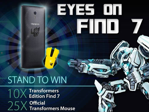 Oppo เวียตนามจัดกิจกรรมพิเศษ "EYES ON Find7" ให้ผู้คนทั่วโลกมาร่วมสนุกโดยเข้าไปกด Like และเล่นเกมส์ผ่าน Facebook ที่ http://www.oppomobile.vn/transformers4/en/? (เกมส์ค้นหาสวิสต์ชาร์จพลัง) ก็จะได้สิทธิเข้าร่วมวัดดวงหาผู้โชคดีทันที