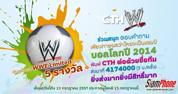 CTH ชวนลุ้นเป็นเจ้าของลูกฟุตบอล Limited edition จาก WWE จำนวน 5 รางวัล เพียงร่วมสนุกทายผลว่า "ประเทศใดจะเป็นแชมป์บอลโลกปี 2014" ร่วมสนุกตอบคำถามพิมพ์ CTH ต่อด้วยชื่อทีมส่งมาที่ #4174000 (3 บ./ครั้ง)