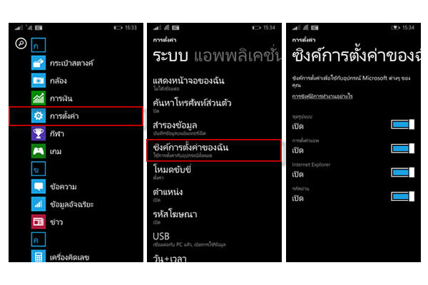 การเปิดใช้งาน "Setting Sync" บนสมาร์ทโฟน Windows Phone 8.1 ทำได้โดยเข้าไปที่ การตั้งค่า > ซิงค์การตั้งค่าของฉัน