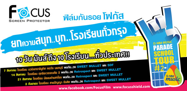 ฟิล์มกันรอยโฟกัส ร่วมกับ จีเอ็มเอ็ม แกรมมี่ ยกทัพศิลปินแบบจัดเต็มทั้งค่าย อาทิ SWEET MULLET, RETROSPECTจัดขบวนพาเรด ค้นหา คนดนตรีหน้าใสที่รักเสียงเพลงในงาน “GMM MUSIC PARADE SCHOOL TOUR 2014” ตอนดาวก็อปเดือน เพื่อมอบความสนุกเอาใจวัยรุ่นคอซอง ขาสั้นในระดับมัธยมศึกษาชั้นนำกว่า 10แห่งทั่วกรุงเทพฯ และปริมณฑล ตลอดเดือนสิงหาคมถึงกันยายนนี้ โดยมีกิจกรรมสนุกสนาน และของรางวัลมากมาย พร้อมนำฟิล์มถนอนสายตา FOCUS BLUE LIGHT CUT มาให้ทดลองใช้กันด้วย