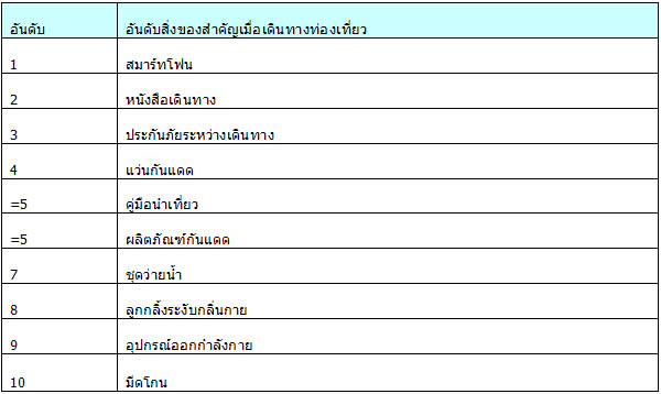 ผลสำรวจจากโฮเทลส์ ดอทคอมยังรายงาน 10 อันดับของใช้ที่จำเป็นสำหรับการท่องเที่ยวซึ่งพบว่าสมาร์ทโฟนคือสื่งที่นักท่องเที่ยวคนไทยให้ความสำคัญเป็นอันดับหนึ่ง ตามมาด้วยหนังสือเดินทางและประกันภัยระหว่างเดินทาง มีดโกนรั้งท้ายตารางในอันดับที่ 10