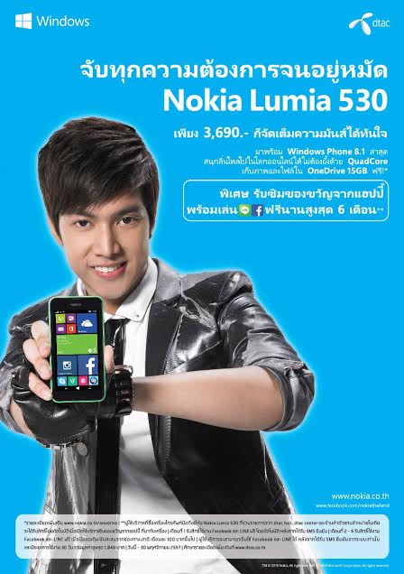 ไมโครซอฟท์ ดีไวซ์ ประเทศไทย จับมือ ดีแทค เปิดตัว Nokia Lumia 530 สมาร์ทโฟนบนระบบปฏิบัติการ Windows Phone 8.1 ราคาเพียง 3,690 บาท ตั้งเป้าเป็นสมาร์ทโฟนหัวหอกขยายฐานผู้ใช้งานสมาร์ทโฟน พร้อมเพิ่มโอกาสให้ผู้บริโภคที่ใช้สมาร์ทโฟนครั้งแรกได้สัมผัสประสบการณ์ 3G มากขึ้นด้วยแพคเกจสุดคุ้มค่าจากดีแทค พร้อมเปิดตัว ‘กั้ง เดอะสตาร์’ พรีเซนเตอร์ของ Nokia Lumia 530