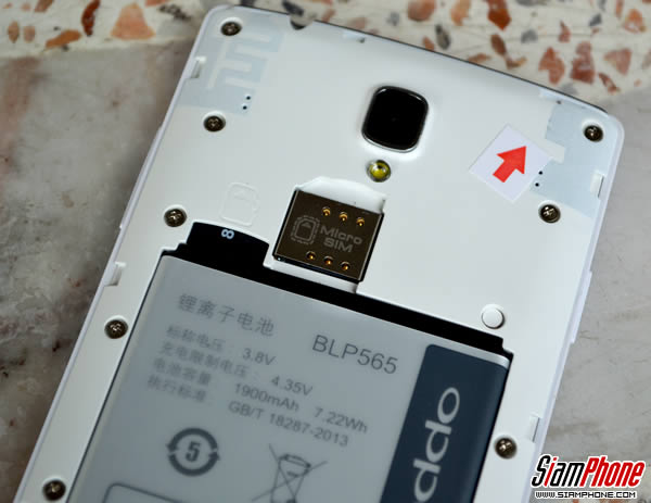 เมื่อแกะฝาหลังออกพบกับก้อนแบตเตอรี่ขนาดความจุ 1,900mAh แบบถอดเปลี่ยนได้ พร้อมช่องเสียบซิมการ์ดแบบ micro SIM และช่องเสียบการ์ดหน่วยความจำ micro SD (อยู่ทางด้านซ้ายของช่องเสียบซิมการ์ด)