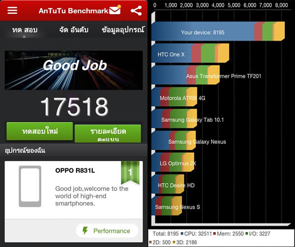 อีกหนึ่งจุดเด่นของ OPPO Neo 5 ที่นอกเหนือจากการรองรับระบบ 4G คือชิปประมวลผล 4 แกน Qualcomm Snapdragon 400 ความเร็ว 1.2GHz และแรมขนาด 1GB ซึ่งเป็นสเปกที่แรงเกินราคาค่าตัวอยู่ไม่น้อย และจากผลการทดสอบประสิทธิภาพด้วยแอพ AnTuTu Benchmark ก็ทำคะแนนไปได้สูงถึง 17,518 แต้ม และกับผลการทดสอบด้วยแอพ Quadrant Standard Edtion ก็ทำคะแนนไปได้ถึง 8,195 แต้ม นับว่ามีประสิทธิภาพแรงเกินราคาค่าตัว และจากการลองใช้งานจริง OPPO Neo 5 ก็ตอบสนองการสั่งงานได้รวดเร็วดี ไม่ว่าจะเป็นการเปิดสลับแอพไปมา รวมถึงการใช้แอพ Chrome เปิดหน้าเว็บเพจ หน้าเว็บบอร์ดต่างๆ ก็ตอบสนองได้ทันใจดี เป็นสมาร์ทโฟนที่เล่นได้ติดนิ้วในราคาเบาๆ