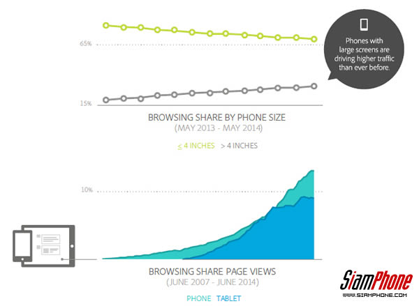 Adobe เปิดเผยรายงาน Mobile Benchmark Report ประจำปี 2557 ซึ่งวิเคราะห์เทรนด์โมบายล์ล่าสุด รวมถึงการใช้งานเครือข่าย Wi-Fi เทียบกับเครือข่ายมือถือ (Cellular), ความสัมพันธ์ของขนาดหน้าจอกับส่วนแบ่งตลาดเบราว์เซอร์, บทบาทของโซเชียลเน็ตเวิร์กสำหรับสมาร์ทโฟนและแท็บเล็ต, การแบ่งปันเนื้อหาคอนเทนต์บนอุปกรณ์ต่างๆ และประเด็นอื่นๆ ข้อมูลสำคัญจาก Adobe Digital Index แสดงให้เห็นว่า “หน้าจอของ iPhone รุ่นใหม่ต้องมีขนาดใหญ่ขึ้น เพื่อแก้ปัญหาแนวโน้มการลดลงของส่วนแบ่งตลาดโมบายล์เบราว์เซอร์” นอกจากนี้ Pinterest ได้กลายเป็นโซเชียลเน็ตเวิร์กที่ใช้งานผ่านอุปกรณ์พกพามากที่สุด ขณะที่ Tumblr ก่อให้เกิดรายได้สูงสุดต่อการเยี่ยมชมหนึ่งครั้ง และการใช้ iBeacons กำลังเป็นที่นิยม และกำลังกลายเป็นกระแสหลัก