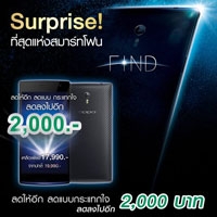 โปรโมชั่นแรงๆ ส่งท้ายปีเก่ากับการหั่นราคา OPPO Find 7 สมาร์ทโฟนรุ่นท็อปตัวแรง จากเดิมที่ราคา 19,990 บาท ลงมาอยู่ที่ 17,990 บาทเท่านั้น พร้อมรับฟรีเคสสวยๆ ตรงรุ่นมูลค่า 490 บาท (เคสมีจำนวนจำกัด แจกจนกว่าของจะหมด) หาซื้อ OPPO Find 7 ได้แล้ววันนี้จาก OPPO Brand Shop ทุกสาขา รวมถึงทุกช่องทางจำหน่ายทั่วประเทศ