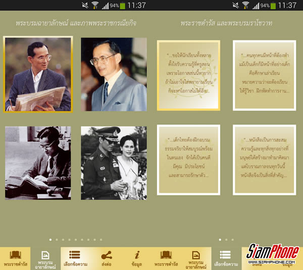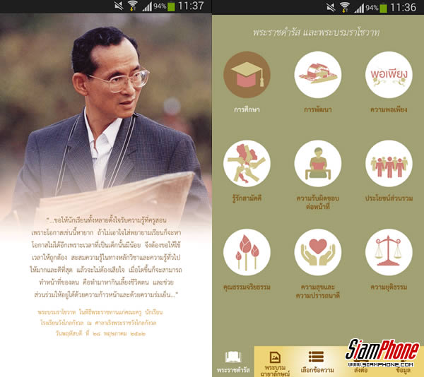 โดยแอปพลิเคชั่นนี้ได้จัดเรียงพระราชดำรัสและพระบรมราโชวาทคัดตัดตอนออกเป็น 9 หมวดหมู่ คือ การศึกษา ความยุติธรรม รู้รักสามัคคี ความรับผิดชอบต่อหน้าที่ ประโยชน์ส่วนรวม การพัฒนา ความพอเพียง คุณธรรมจริยธรรม ความสุขและความปรารถนาดี