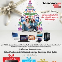เลอโนโว ผู้นำยอดขายคอมพิวเตอร์อันดับ 1 ของโลก มอบความสุขส่งท้ายปี จัดโปรโมชั่นพิเศษแจกของขวัญสำหรับลูกค้าเลอโนโวกว่า 10,000 รายการ สำหรับลูกค้าที่ซื้อโน๊ตบุ๊ค, ออลอินวัน, เดสก์ท๊อป และแท็บแล็ตทุกรุ่น มีสิทธิ์พิเศษในการจับรางวัล เพียงแสดงใบเสร็จรับเงินที่มีซีเรียลนัมเบอร์ ณ วันที่ซื้อ ตามสถานที่ดังต่อไปนี้ พันธ์ทิยพ์ประตูน้ำ, ไอทีมอลล์ - ฟอร์จูน รัชดา และ เซียร์ รังสิต ตั้งแต่วันที่ 5-28 ธันวาคม 2557 นี้ (จำกัด 1 สิทธิ์ 1 ใบเสร็จ / ท่าน)