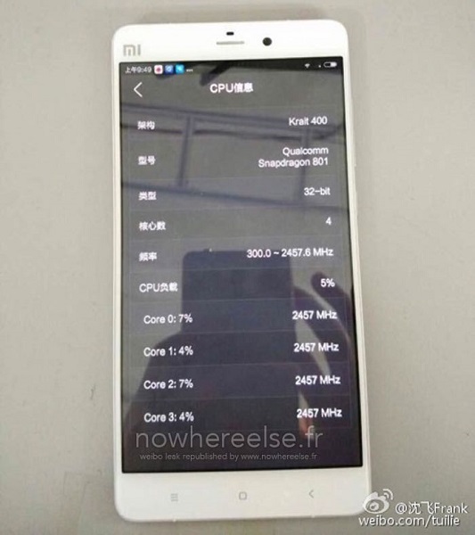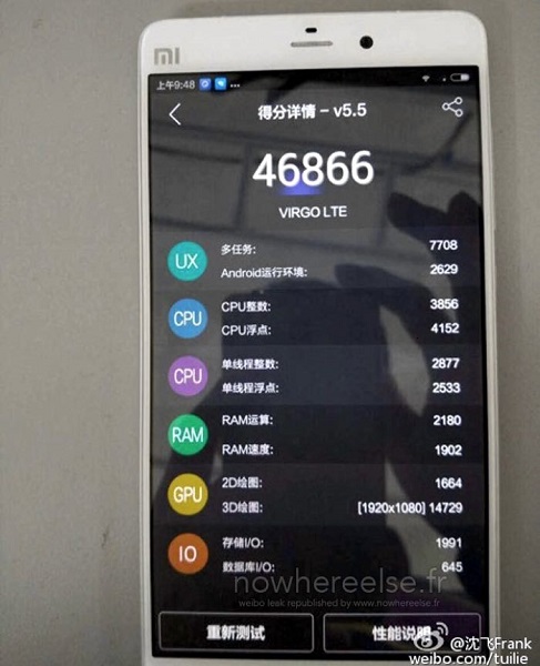 โดยภาพการทดสอบดังกล่าวแสดงให้เห็นว่าสมาร์ทโฟน Xiaomi Mi5 ได้คะแนนในการทดสอบ 46,866 แต้ม และคาดกันว่าจะมาพร้อมกับหน่วยประมวลผลในรุ่น Snapdragon 805 หรือ Snapdragon 810 อีกด้วย ในส่วนของรายละเอียด RAM นั้นยังไม่แน่ชัดว่าจะมาพร้อมกับขนาด 2GB หรือ 3GB กันแน่ คงต้องอดใจรอชมในวันเปิดตัวอย่างเป็นทางการอีกครั้ง