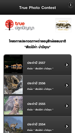 บมจ. ทรู คอร์ปอเรชั่น โดยโครงการทรูปลูกปัญญา เชิญชวนผู้มีหัวใจรักธรรมชาติ ดาวน์โหลด “True Photo Contest” แอพพลิเคชั่นคลังภาพออนไลน์ที่รวบรวมผลงานที่ชนะการประกวดโครงการประกวดภาพถ่ายอนุรักษ์ธรรมชาติ “สัตว์มีค่า ป่ามีคุณ” กว่า 300 ผลงาน ในรอบ 20 ปี ตั้งแต่ปี 2538 – 2557 โดยผู้ใช้งาน สามารถคลิกเข้าไปชมภาพถ่ายอันทรงคุณค่าที่หาดูได้ยากนี้ พร้อม save รูปที่ ชื่นชอบเก็บไว้ พร้อมเมนู “Information” สำหรับคลิกเข้าไปศึกษาเรื่องราวที่น่าสนใจของแต่ละภาพ ซึ่งจะมีลิงค์ต่างๆ ที่เกี่ยวข้องเพื่อให้ข้อมูลเพิ่มเติมเกี่ยวกับพืชหรือสัตว์ป่าในภาพ ในรูปแบบวิกิพีเดีย และยูทูบ นอกจากนี้ ยังสามารถ share เพื่อแบ่งปันและส่งต่อความงดงามของผลงานผ่านอีเมล หรือโซเชี่ยลเน็ตเวิร์คต่างๆ อาทิ เฟซบุ๊ค และทวิตเตอร์ได้อีกด้วย
