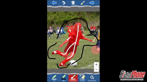วิธีการใช้งาน StickIt! ไม่ยากโดยเครื่องมือหลักมีเพียง 5 อย่างคือ "FG" ลากเส้นบนวัตถุที่ต้องการภาพจะมีสีแดงทั้งภาพจากนั้นเลือก "BG" ลากเส้นเพื่อลบฉากหลังแล้วบริเวณสีแดงจะลดครอบคลุมแค่ส่วนที่ต้องการ "FG(Paint)" แต้มแต้มบริเวณที่ต้องการเติมเฉพาะส่วน "Eraser" ลบบริเวณสีแดงที่ไม่ต้องการ และสุดท้าย "Pan/Zoom" ลดหรือขยายภาพในการเก็บรายละเอียดต่างๆ ซึ่งสามารถเลือกใช้ปุ่มบวกลบที่มุมขวามือด้านล่างแทนได้เช่นกัน