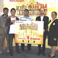 เมื่อเร็วๆนี้ มร. มาซามิ โออุเอะ กรรมการผู้จัดการบริษัท ชาร์ป ไทย จำกัด ผู้ผลิตและจัดจำหน่ายเครื่องใช้ไฟฟ้า อุปกรณ์สำนักงาน และแผงโซลาร์ชั้นนำของโลก มอบทองคำให้กับผู้โชคดีคนแรกมูลค่า 1,000,000 บาทให้กับ คุณยุทธนา ศิริเจริญซึ่งซื้อ Sharp LED ขนาด 39 นิ้ว จากแคมเปญ “ช้อปลุ้นล้าน” ฉลองเทศกาลปีใหม่ โดยการส่งใบเสร็จซื้อสินค้าชาร์ปมาร่วมชิงโชคตั้งแต่ 1 ธันวาคม 2557 ถึง 31 มกราคม 2558 ที่ผ่านมา