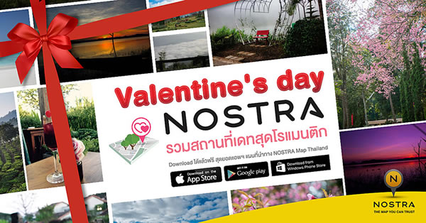 โดยสามารถเลือกเปิด (Map layer ) “100 พิกัดเดทวาเลนไทน์” ก็สามารถดูข้อมูล แผนที่เดินทาง และตำแหน่งที่ตั้ง พร้อมออกเดินทางด้วยฟังก์ชั่นค้นหาเส้นทางกันได้ง่าย สะดวก รวดเร็ว หากยังคิดไม่ออกว่า จะว่าจะแพลนพาหวานใจ หรือครอบครัวไปที่ไหน ง่ายๆ เพียงดาวน์โหลดแอพพลิเคชั่นแผนที่ NOSTRA Map Thailand พร้อมให้บริการแล้วทุก Platform