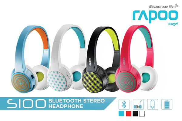 Rapoo ผู้ผลิตอุปกรณ์ต่อพ่วงไร้สายชั้นนำ ของโลก เปิดตัวหูฟังบลูทูธแบบครอบศีรษะสุดเทรนดี้รุ่น S100 อัดแน่นด้วยฟังก์ชั่นครบครัน ล้ำหน้าด้วยเทคโนโลยี Bluetooth 4.1 ทั้งยังสามารถสนุกไปกับการถอดเปลี่ยนกรอบหูฟังได้ และมีให้เลือก 4 สี หูฟังบลูทูธ S100 มาพร้อมกับคุณภาพเสียงทรงพลัง ให้เสียงคมชัดแบบสมจริง พร้อมดีไซน์ทันสมัยเข้ากับไลฟ์สไตล์ในปัจจุบันได้อย่างลงตัว หูฟังมีน้ำหนักเบา พกพาสะดวก ผลิตจากวัสดุคุณภาพดีแข็งแรงทนทาน ใช้ฟังได้ทั้งแบบไร้สายหรือแบบมีสาย และเพิ่มความสะดวกด้วยการชาร์จแบตเตอรี่ลิเธี่ยมโดยเชื่อมต่อผ่านพอร์ต USB ได้
