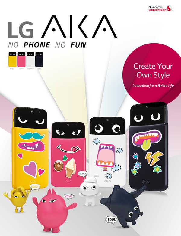 LG AKA มีคาแร็คเตอร์ให้เลือก 4 แบบ ได้แก่ Eggy สีเหลืองคาซิโนวาตัวจริง ที่มักตกหลุมรักอยู่บ่อยครั้ง Wooky สีขาวเจ้าอารมณ์สุดติสต์ Soul สีน้ำเงินผู้อ่อนโยนและหลงรักเสียงดนตรีเป็นที่สุด และสุดท้าย Yo-Yo สีชมพูที่พยายามควบคุมน้ำหนักอยู่ตลอดเวลาและรักการกินเป็นที่สุด คาแร็คเตอร์แต่ละสีของ AKA จะมาพร้อมกับวอลเปเปอร์ Widget ธีมและเสียงริงโทนที่แตกต่างกัน นอกเหนือจากปฏิกิริยาโต้ตอบกับผู้ใช้งานผ่านดวงตาแสดงอารมณ์ที่แตกต่างกันในแต่ละคาแร็คเตอร์แล้ว ผู้ใช้ยังสามารถเลือกตกแต่ง AKA ตามสไตล์ของตนเองโดยใช้สติ๊กเกอร์ (มาพร้อมตัวเครื่องหรือสามารถซื้อเพิ่มเติมได้) ปากกา และสีวาดลวดลายลงบนตัวเครื่องได้อีกด้วย แนวคิดที่คำนึงถึงผู้บริโภคเป็นหลักนี้ส่งผลให้สมาร์ทโฟน AKA ได้รับรางวัล iF Design ด้านแนวทางการออกแบบสมาร์ทโฟนที่แปลกใหม่ไม่ซ้ำใคร