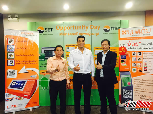 นายสมชัย สูงสว่าง กรรมการผู้จัดการ พร้อมด้วย นายณรงค์ศักดิ์ เลิศทรัพย์ทวี ผู้ช่วยกรรมการผู้จัดการ บมจ.ฟอร์ท สมาร์ท เซอร์วิส (FSMART) ผู้ให้บริการตู้เติมเงินโทรศัพท์มือถือแบรนด์ ”บุญเติม” ร่วมให้ข้อมูลผลประกอบการไตรมาสที่ 1/2558 ในงานบริษัทจดทะเบียนพบนักลงทุน