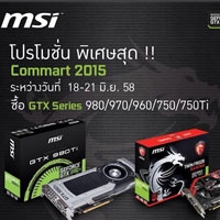 กลับมาอีกครั้ง สำหรับงานไอทีที่ยิ่งใหญ่ระดับประเทศอย่าง "คอมมาร์ต ไทยแลนด์ 2015" ที่จะมีขึ้นในวันที่ 18-21 มิถุนายน 2558 ณ ศูนย์ประชุมแห่งชาติสิริกิติ์ โดยในครั้งนี้บริษัท เอสเซนตี้ รีซอร์สเซส ผู้นำเข้า และจัดจำหน่ายกราฟิกการ์ดแบรนด์ MSI ร่วมกับ NVIDIA ผู้ผลิตชิปประมวลกราฟิกการ์ดระดับโลก จัดโปรโมชั่นสุดพิเศษเอาใจแฟนๆ คอเกม สำหรับท่านที่ซื้อสินค้ากราฟิกการ์ด MSI ในรุ่น GTX Series 750/960/970/980 ภายในงาน Commart 2015 สามารถนำใบเสร็จสินค้ามาลุ้นจับรางวัล Lucky Draw (1 ชิ้น ต่อ 1 ครั้ง) ได้ที่บุธ MSI @ J.I.B. ลุ้นรับของรางวัลมากมาย เช่น สร้อยคอทองคำ 1 สลึง, SSD Plextor M6 pro, เมาส์ Razer Deathadder chroma, หูฟัง Razer Hamerhead, Flash Drive MSI, NVIDIA Bag, เป็นต้น