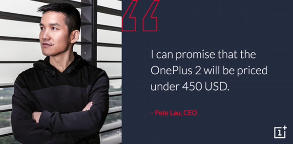 ใกล้เข้ามาแล้วกับกำหนดการเปิดตัวในวันที่ 27 กรกฏาคม 2558 สำหรับ "OnePlus 2" สมาร์ทโฟนดีไซน์พรีเมี่ยม สเปกจัดเต็ม แต่ให้จับจองได้ในราคาที่ถูก โดยคราวนี้ผู้บริหารหนุ่มไฟแรงได้บอกกับสื่อว่า "I can promis that the OnePlus 2 will be priced under $450" นั่นหมายถึงสมาร์ทโฟนรุ่นดังกล่าวจะมีราคาตํ่ากว่าประมาณ 15,200 บาท