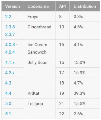 Google เผยสถิติล่าสุดในเดือนสิงหาคมพบว่ามีสมาร์ทโฟนแอนดรอยด์ 15.5% จากทั้งหมดรันบนแพลตฟอร์ม Android 5.0 และ 2.6% จากทั้งหมดรันบนแพลตฟอร์ม Android 5.1 ทำให้แพลตฟอร์ม Android 5.x Lollipop มีสัดส่วนการใช้งานเพิ่มขึ้นเป็น 18.1% แล้ว โดยเพิ่มขึ้นจากเดือนที่ผ่านมาซึ่งเคยมีสัดส่วนการใช้งาน Android 5.x Lollipop เพียง 5.7% เท่านั้น