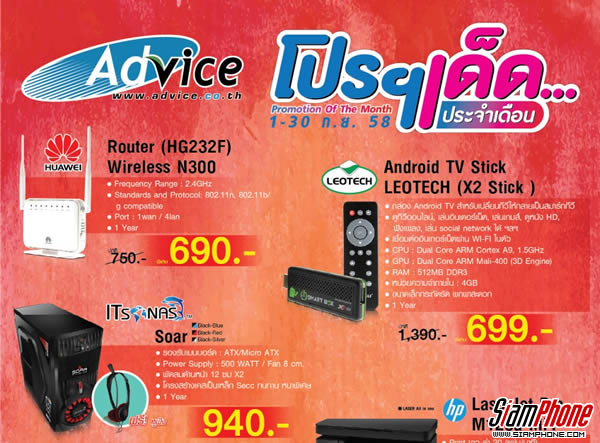 แอดไวซ์ (Advice) ผู้นำธุรกิจร้านค้าไอทีและสมาร์ทโฟนรายใหญ่ มีเครือข่ายครอบคลุมกว่า 350 สาขาทั่วประเทศไทย จัดโปรโมชั่นพิเศษประจำเดือนกันยายน 2558 เอาใจลูกค้านักช็อปด้วยสินค้าและอุปกรณ์ด้านไอทีระดับพรีเมี่ยมให้ท่านได้เลือกสรร พร้อมเสิร์ฟออร์เดิร์ฟเด็ด 6 รายการดังต่อไปนี้