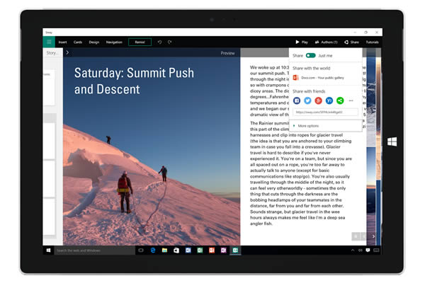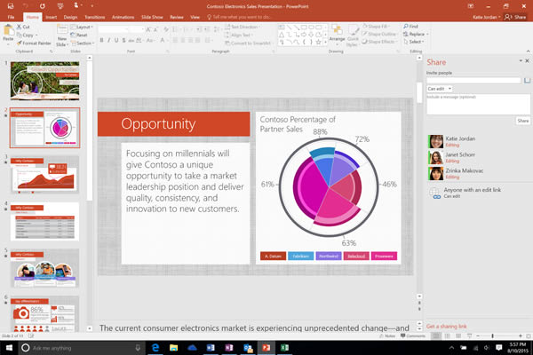 Office 2016 และ Windows 10 เป็นโซลูชั่นการทำงานร่วมกันที่สมบูรณ์ที่สุด Office 2016 ใช้งานได้อย่างราบรื่นที่สุดบน Windows 10 รวมไปถึงแอพฯ Sway1 บน Windows 10 ที่ให้คุณสร้างเรื่องราวแบบอินเตอร์แอคทีฟและสามารถแชร์กับผู้อื่นได้อย่างล้ำหน้าขึ้นอีกระดับ อีกทั้งยังสามารถใช้ฟีเจอร์ Windows Hello2 ให้คุณล็อกอินเข้า Windows และ Office 365 ง่ายดายเพียงขั้นตอนเดียว แอพฯ Office Mobile บน Windows 10 เพิ่มศักยภาพสำหรับการทำงานนอกสถานที่ รวมไปถึงฟีเจอร์ Continuum3 ที่การทำงานบนโทรศัพท์เป็นแบบเดียวกับการใช้งานบนเครื่องคอมพิวเตอร์พีซี ฟีเจอร์ Cortana4 สามารถเชื่อมต่อกับ Office 365 เพื่อช่วยให้คุณจัดการกับสิ่งที่ได้รับมอบหมาย อาทิ การเตรียมการประชุม และสามารถทำงานร่วมกับโปรแกรม Outlook ได้ในเดือนพฤศจิกายนนี้