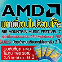 และในงานนี้ ร้าน MediaZ ซึ่งเป็นร้านที่มีชื่อเสียงทางด้านประกอบเครื่องคอมพิวเตอร์ (DIY) จะมาช่วยให้คำแนะนำ สำหรับท่านที่ต้องการจะประกอบเครื่องอีกด้วย พิเศษสุดเรามี Promotion สุดโจ๊ะเพื่อลุ้นรับบัตรฟรีเข้างาน Big Mountain Music Festival ครั้งที่ 7 และโปรโมชั่นอื่นๆ อีกมากมาย มาลุ้นกันว่าในวันที่ 17 ต.ค. นี้ AMD จะได้รับรางวัลอะไรบ้างจากงาน Thailand Game Show BIG Festival 2015 ในปีนี้ แล้วพบกัน