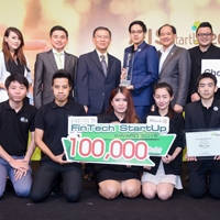 นายปกรณ์ พรรธนะแพทย์ รองกรรมการผู้จัดการอาวุโส ธนาคารกสิกรไทย มอบรางวัล Best FinTech StartUp Award แก่ นายนรธัช สินธวานนท์ ผู้ก่อตั้งบริษัท ชอกโก การ์ด เอนเทอร์ไพรส์ จำกัด หนึ่งในผู้เข้าประกวดในโครงการ AIS The StartUp 2015 ที่มีความโดดเด่นในการเป็นผลงานนวัตกรรมที่นำเทคโนโลยีดิจิตอลมาใช้ให้เกิดประสิทธิภาพสูงสุดในเชิงโซลูชันทางด้านการเงิน
