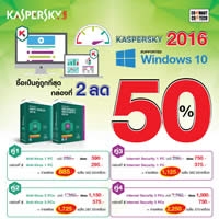 แคสเปอร์สกี้ แลป จับมือไอคอมเทค ยกขบวนซอฟต์แวร์สู้ภัยไซเบอร์ที่คุณไม่ควรพลาดทั้ง Kaspersky Internet Security (KIS) 2016 และ Kaspersky Antivirus (KAV) 2016 ช่วยปกป้องภัยออนไลน์ สกัดช่องทางโจมตี ป้องกันการขโมยเงินและข้อมูล พร้อมโปรโมชั่นพิเศษ “ซื้อเป็นคู่ถูกที่สุด” ซื้อผลิตภัณฑ์กล่องแรกในราคาพิเศษ และกล่องที่สองในราคา 50% ยังไม่หมดเท่านี้! รับฟรี! พัด Kaspersky เพียงกด Like เพจ KasperskyThai