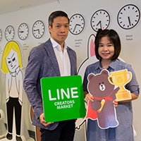 อริยะ พนมยงค์ กรรมการผู้จัดการ LINE ประเทศไทย แสดงความยินดี และ มอบเงินรางวัล 50,000 บาท พร้อมของขวัญให้แก่ผู้ชนะจากโครงการ Rising Star พิชญณัฎฐ์ พูลสวัสดิ์ นักออกแบบดาวรุ่งเจ้าของสติกเตอร์ “ซันนี่ ที่รัก” ซึ่งมียอดขายสูงสุดในครีเอเตอร์มาร์เก็ตประจำเดือนตุลาคม ณ สำนักงาน LINE ประเทศไทย เมื่อเร็วๆ นี้