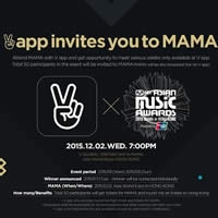‘V’ แอพพลิเคชันบนสมาร์ทโฟนที่ให้บริการถ่ายทอดชีวิตซุปตาร์แบบเรียลไทม์ ขนโปรเจ็กพิเศษส่งท้ายปี พร้อมพาแฟนคลับผู้โชคดีจากทั่วโลกทั้งหมด 50 ท่าน บินลัดฟ้าสู่ฮ่องกง เพื่อเข้าร่วมงานประกาศผลรางวัลทางดนตรีที่ใหญ่ที่สุดในเอเชียอย่าง 2015 Mnet Asian Music Awards (MAMA) ในวันที่ 2 ธันวาคม นี้ โดยผู้โชคดีจาก ‘V’ แอพ จะได้รับตั๋วเครื่องบินไป – กลับ ไปยังฮ่องกง และบัตรเข้าชมงานประกาศผลรางวัล เพียงส่งใบสมัครเข้าร่วมกิจกรรม ระหว่างวันที่ 11 – 15 พฤศจิกายน นี้