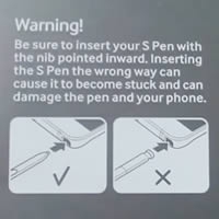 ย้ำอีกทีว่าวิธีเก็บปากกา S Pen เข้าเครื่องที่ถูกต้องก็คือหันหัวปากกา (เอาด้านที่ใช้เขียนสอดนำเข้าไปในช่องเสียบปากกา) ปัญหาเล็กๆ แต่ไม่เล็กสำหรับลูกค้า ทำให้งานนี้ Samsung ถึงขั้นติดป้ายเตือนกันเลยทีเดียว....