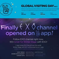 ‘V’ แอพพลิเคชันถ่ายทอดชีวิตซุปตาร์แบบเรียลไทม์บนสมาร์ทโฟน มีความยินดีเป็นอย่างยิ่งที่จะนำแฟนคลับหนุ่มๆ วง EXO บินลัดฟ้าสู่เกาหลีใต้ ภายใต้แคมเปญ Global Visiting Day ซึ่งจัดขึ้นเป็นครั้งที่ 3 โดยแฟนคลับผู้โชคดีทั้ง 100 ท่าน จะได้รับตั๋วเครื่องบินไป – กลับ ประเทศเกาหลีใต้ พร้อมบัตรเข้าชมการแสดงสุดพิเศษจาก EXO ใน Winter Stage สำหรับการลุ้นเป็น 1 ในร้อยคนผู้โชคดีครั้งนี้ ผู้สมัครจะต้องฟอลโลวช่องของ EXO บน ‘V’ แอพ ก่อนที่จะส่งใบสมัคร โดยจะเปิดให้แฟนคลับทั่วโลกได้ลวทะเบียนเข้าร่วมกิจกรรมพร้อมกันระหว่างวันที่ 19 – 24 พฤศจิกายนนี้