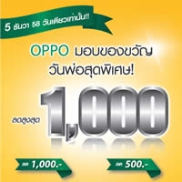 วันพ่อปีนี้ OPPO มอบของขวัญสุดพิเศษ เพียงวันเดียวเท่านั้น!! ที่สุดของความคุ้มค่ากับโปรโมชั่นจัดเต็ม สำหรับลูกค้าทุกท่าน ด้วยโปรโมชั่นส่วนลดค่าเครื่องกับ 5 รุ่นสุดฮอต สำหรับใครที่กำลังมองหาสมาร์ทโฟน สเปคแรง บอดี้หรูหราด้วยโลหะพรีเมี่ยม พร้อมกล้องขั้นเทพ คมชัด 13 ล้านพิกเซลที่โฟกัสฉับไว ในสไตล์โฉบเฉี่ยวโดนใจ ต้องไม่พลาดกับส่วนลดมูลค่าเครื่องสูงสุดถึง 1,000 บาท สำหรับ OPPO R7s จากราคาปกติ 14,990 บาท เหลือเพียง 13,990 บาท และ OPPO R7 Lite จากราคาปกติ 10,990 บาท เหลือเพียง 9,990 บาท