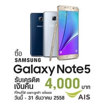 เฉพาะลูกค้า AIS ทุกประเภท เมื่อซื้อ Samsung Galaxy Note5 ทุกรุ่น ที่ร้านจำหน่ายโทรศัพท์มือถือที่ไหนก้ได้ทั่วประเทศ เมื่อชำระค่าเครื่องด้วยบัตรเครดิตที่ร่วมรายการ (ชำระเต็มจำนวน หรือ ผ่อนชำระ) รับเครดิตเงินคือ 4,000 บาทเข้าบัญชีบัตรเครดิต ภายใน 60 วัน กรณีชำระแบบเงินผ่อนรับเครดิตเงินคือเข้าบัญชีภายใน 120 วัน สามารถนำใบเสร็จรับเงินยืนยันการซื้อสินค้า รับสิทธิ์ได้ที่ศูนย์บริการ AIS Shop ทุกสาขาทั่วประเทศ ตั้งแต่วันนี้-31ธันวาคม 2558