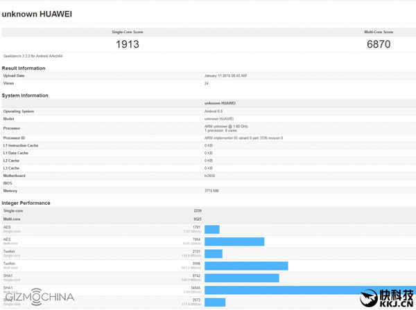 โดยผลคะแนน Benchmark ดังกล่าวได้ถูกทดสอบบนโปรแกรม GeekBench ซึ่งสามารถทำคะแนนทดสอบแบบ Single-Core ได้คะแนน 1,913 และทำคะแนนทดสอบแบบ Multi-Core ได้คะแนน 6,870 ซึ่งผลทดสอบที่ออกมาพบว่าสามารถทำคะแนนได้สูงกว่าสมาร์ทโฟนรุ่นล่าสุดอย่าง Huawei Mate 8 อีกด้วย อีกทั้งยังมีการเปิดเผยอีกด้วยว่าสมาร์ท โฟนตัวท็อปรุ่นใหม่นี้จะมาพร้อม RAM ขนาด 4GB อย่างแน่นอน และในส่วนของหน่วยประมวลผลยังไม่มีการเปิดเผยมาให้ได้ทราบแต่อย่างใด สุดท้ายคงต้องมารอลุ้นกันว่าจะใช่ Huawei P9 หรือไม่นั่นเอง