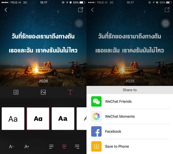 JOOX ฟรีมิวสิคแอปพลิเคชั่น ล่าสุดปล่อยฟีเจอร์เด็ด ‘Lyrics Card’ เอาใจคนรักเสียงเพลงได้เเบ่งปันเนื้อร้องเป็นข้อความโดนๆ สื่อถึงคนที่คุณรัก เพื่อนๆ หรือครอบครัวได้ทันทีผ่าน Facebook เเละ WeChat โดยสามารถเลือกท่อนเพลงที่ชอบได้สูงสุดถึง 5 ท่อน พร้อมปรับเปลี่ยนภาพพื้นเเละรูปแบบตัวอักษรเติมเต็มอารมณ์ความรู้สึก ฟีเจอร์ ‘Lyrics Card’ รองรับการใช้งานเเล้ววันนี้ทั้งผู้ใช้อุปกรณ์ iOS และ Android
