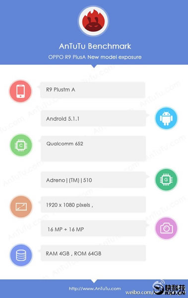 โดยข้อมูลสเปกดังกล่าวถูกตรวจพบผ่านแอพ Benchmark ชื่อดังอย่าง AnTuTu และมีข้อมูลแสดงให้เห็นอย่างชัดเจนว่า R9 Plus จะมาพร้อมกล้องหน้า/หลัง ความละเอียด 16 ล้านพิกเซลอีกด้วย รวมไปถึงยังมีการเปิดเผยรายละเอียดสเปกในส่วนอื่นด้วย เช่น จะมีหน้าจอความละเอียดระดับ Full HD, CPU Snapdragon 652, RAM 4GB, ROM 64GB, รันแอนดรอยด์เวอร์ชั่น 5.1.1 Lollipop คงต้องอดใจรอชมในวันเปิดตัวจริง 17 มีนาคม ที่จะถึงนี้