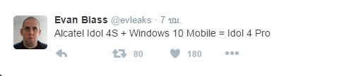 มีภาพเรนเดอร์ของสมาร์ทโฟน Alcatel Onetouch Idol 4 Pro เผยออกมาจากบัญชีทวิตเตอร์จอมปล่อยภาพหลุด @evleaks โดยสมาร์ทโฟนรุ่นนี้มีความคล้ายคลึงกับ Alcatel Idol 4s ที่เปิดตัวออกมาในงาน MWC 2016 แต่รันบนแพลตฟอร์ม Windows 10 Mobile