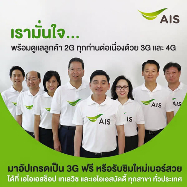 AIS เดินหน้าดูแลลูกค้า อำนวยความสะดวก ช่วยลูกค้าเปลี่ยนจาก 2G 900 MHz เป็น 3G ฟรี! ทั้งเบอร์ และเครื่อง พร้อมจัดเต็มสื่อโฆษณาถึงตัวลูกค้าทั่วประเทศ กระตุ้นให้รับทราบเพื่อให้มาเปลี่ยนเป็น 3G ได้ทันเวลา หลังศาลปกครองและ กสทช. ขยายเวลาดูแลลูกค้าถึง 14 เมษายน 2559 (คลิกอ่านรายละเอียดข่าวเพิ่มเติม)