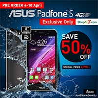 Shopat7.com เปิดจองมือถือ Asus Padfone S สเปคจัดเต็ม ด้วยมาตรฐานกันน้ำ IPX2 กันทั้งฝนและละอองน้ำ พกไปเล่นสงกรานต์ได้แบบชิวๆ ไม่ต้องกลัวเปียก พร้อมหน้าจอแบบ Dynamic Display 5 นิ้ว Full HD กล้องความคมชัด 13 ล้านพิกเซล หน่วยประมวลผล Quad-core 2.3 GHz Ram 2GB รันบนแพลทฟอร์ม Android 4.4 (Kitkat) หั่นครึ่งราคา ปกติ 9,990 เหลือเพียง 4,990 บาท เปิดจองตั้งแต่วันที่ 4 – 10 เม.ย. 59 เฉพาะที่ Shopat7.com จัดส่งฟรีที่เซเว่นอีเลฟเว่นทุกสาขา
