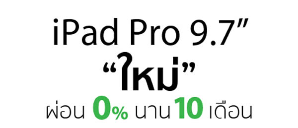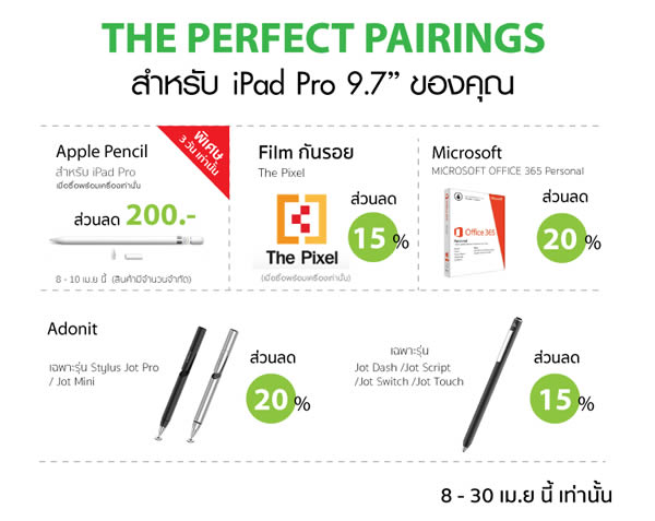 เมื่อซื้อ iPad Pro 9.7 ได้รับส่วนลด 200 บาท ในการแลกซื้อ Apple Pencil จากราคา 3,900 บาท เหลือ 3,700 บาท จำกัดเฉพาะ 3 วันแรกเท่านั้น (8-10 เมษา 59)