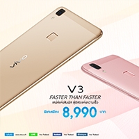 ตั้งแต่วันนี้เป็นต้นไป Vivo ได้วางจำหน่ายรุ่น V3 ซึ่งมาพร้อมกับ CPU Qualcomm Snapdragon 616 1.5GHz Octa-core 64bit RAM 3GB ROM 32GB ปลดล็อคด้วยการสแกนลายนิ้วมือ มีทั้งหมด 2 สี คือ สีโรสโกล (Rose Gold) และ สีทอง (Gold) เริ่มวางจำหน่ายในราคา 8,990 บาท