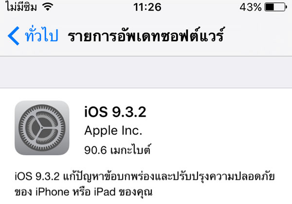 มีซอฟต์แวร์เวอร์ชั่นใหม่ให้อัพเดทกันแล้ว สำหรับเหล่าสาวก iDevice ที่ทาง Apple ได้ปล่อย iOS 9.3.2 ให้ดาวน์โหลดกัน โดยการอัพเดทครั้งนี้ เกี่ยวกับการแก้ไขบั๊กและเพิ่มความเสถียรในการใช้งาน รวมถึงด้านความปลอดภัยในการใช้งาน (คลิกอ่านรายละเอียดข่าวเพิ่มเติม)