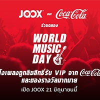 JOOX และ Coca Cola ขอเป็นผู้นำกระแสการฟังเพลงอย่างถูกลิขสิทธิ์รับ World Music Day ในวันที่ 21 มิถุนายนนี้ ร่วมกับพาร์ทเนอร์ และศิลปินอีกมากมาย แจก JOOX VIP และของรางวัลเพียบผ่าน JOOX มิวสิค แอปพลิเคชั่น เพียงแค่คุณเปิด JOOX ในวันที่ 21 มิถุนายนนี้ ก็สามารถคลิกเพื่อรับของรางวัลไม่ว่าจะเป็น JOOX VIP สูงสุด 1 ปี ที่มอบให้คุณโดย Coca Cola ของรางวัลจากเจบีแอล, เมเจอร์ ซิเนเพล็กซ์ ฯลฯ ของที่ระลึกจากจีเอ็มเอ็ม แกรมมี่, บีอีซี-เทโร, สไปร์ซซี ดิสก์, วอร์เนอร์ มิวสิค, ยูนิเวอร์แซล มิวสิค และวอท เดอะ ดัก ของขวัญพร้อมลายเซ็นจากบอดี้สแลม, ฟักกลิ้ง ฮีโร่, ไทเทเนียม และไนน์เฟซ, บิ๊กแอส, สิงโต นำโชค และพงษ์สิทธิ์ คัมภีร์ และของที่ระลึกอื่นๆ อีกมากมายจาก JOOX
