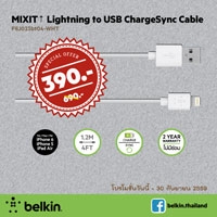 สำหรับผู้ที่ใช้งานสาย Lightning วันนี้ทาง Belkin มีข่าวดีๆ มานำเสนอ สำหรับผู้ที่มีสายเก่า สายเน่า สายต่างยี่ห้อ สายจีน เพียงนำสายต่างๆ เหล่านี้ มารับสิทธิแลกซื้อสาย Lightning ใหม่ ในราคาพิเศษ 390 บาท (รุ่น MIXIT↑ Lightning to USB ChargeSync Cable - F8J023bt04-WHT)