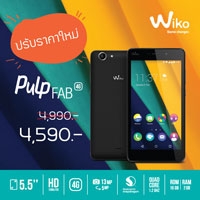 Wiko สมาร์ทโฟนจากฝรั่งเศส เอาใจคนชอบความคุ้ม กับสมาร์ทโฟน 4G ฟังก์ชั่นครบครัน “Wiko Pulp Fab 4G” โดดเด่นด้วยหน้าจอคมชัดระดับ HD ขนาดใหญ่ 5.5 นิ้ว ป้องกันรอยขีดข่วนด้วยกระจก Corning Gorilla Glass 3 เร็วแรงด้วยซีพียู Qualcomm Snapdragon 410 Quad Core 1.2 GHz มาพร้อมหน่วยความจำ ROM 16 GB, RAM 2 GB รองรับ 4G ทุกเครือข่ายในเมืองไทย และภาพถ่ายที่คมชัดด้วยกล้องหลัง 13 MP และ กล้องหน้า 5 MP มีสี Black/Grey และ White/Gold ในราคาพิเศษ 4,590 บาท (จากปกติ 4,990 บาท) หาซื้อได้ที่ตัวแทนจำหน่ายทั่วประเทศ