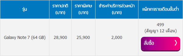หรือเพียงสมัครแพ็กเกจรายเดือนขั้นต่ำ 399 บาท (สัญญา 6 เดือน) ก็ได้ส่วนลดค่าเครื่อง Samsung Galaxy Note 7 เหลือเพียง 28,900 บาท