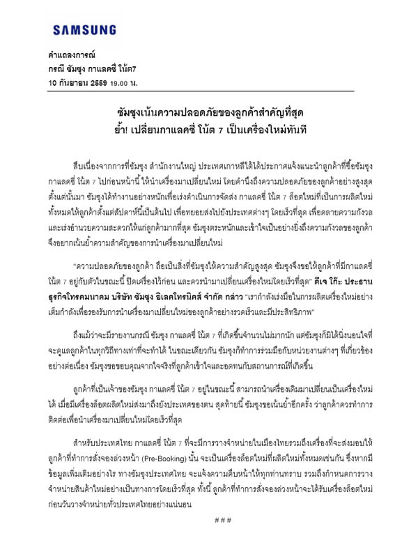 “ความปลอดภัยของลูกค้า ถือเป็นสิ่งที่ซัมซุงให้ความสำคัญสูงสุด ซัมซุงจึงขอให้ลูกค้าที่มีกาแลคซี่ โน้ต 7 อยู่กับตัวในขณะนี้ ปิดเครื่องไว้ก่อน และควรนำมาเปลี่ยนเครื่องใหม่โดยเร็วที่สุด” ดีเจ โก๊ะ ประธานธุรกิจโทรคมนาคม บริษัท ซัมซุง อิเลคโทรนิคส์ จำกัด กล่าว “เรากำลังเร่งมือในการผลิตเครื่องใหม่อย่างเต็มกำลังเพื่อรองรับการนำเครื่องมาเปลี่ยนใหม่ของลูกค้าอย่างรวดเร็วและมีประสิทธิภาพ”